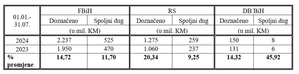 U tablici ispod predstavljen je prikaz ukupno raspoređenih sredstava entitetima i Distriktu Brčko BiH sa pripadajućim spoljnim dugom za sedam mjeseci 2024. godine u poređenju sa istim periodom prošle godine. Svi iznosi su iskazani u milionima KM.