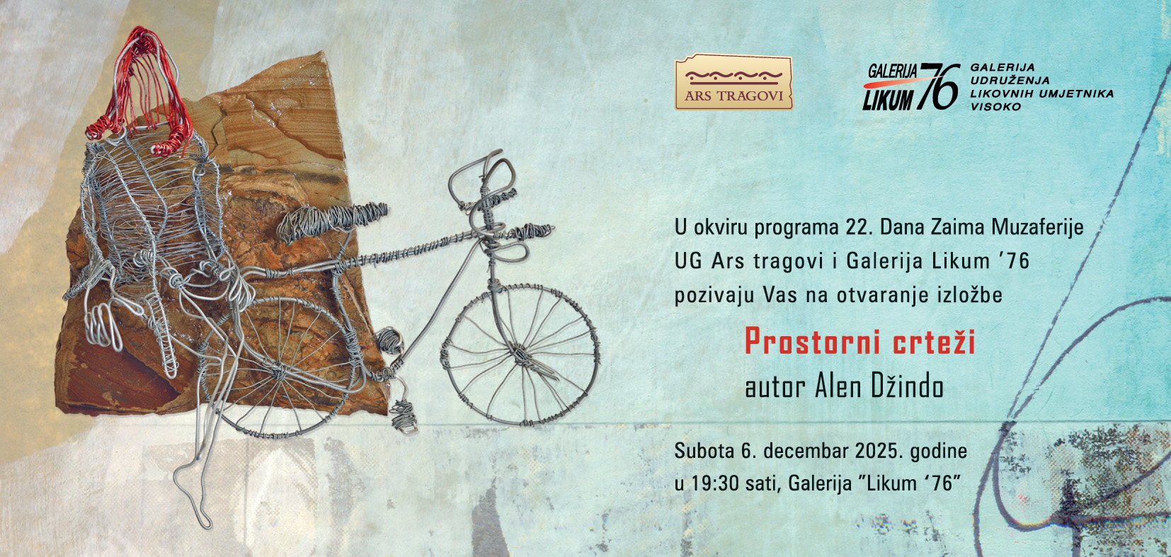 U okviru tradicionalne manifestacije “Dani Zaima Muzaferije”, u Visokom će u subotu, 6. decembra, sa početkom u 19:30 sati, biti svečano otvorena izložba visočkog umjetnika Alena Džinde pod nazivom “Prostorni crteži”. Izložba će biti postavljena u Galeriji “Likum ’76”, a ulaz za sve posjetioce je slobodan.