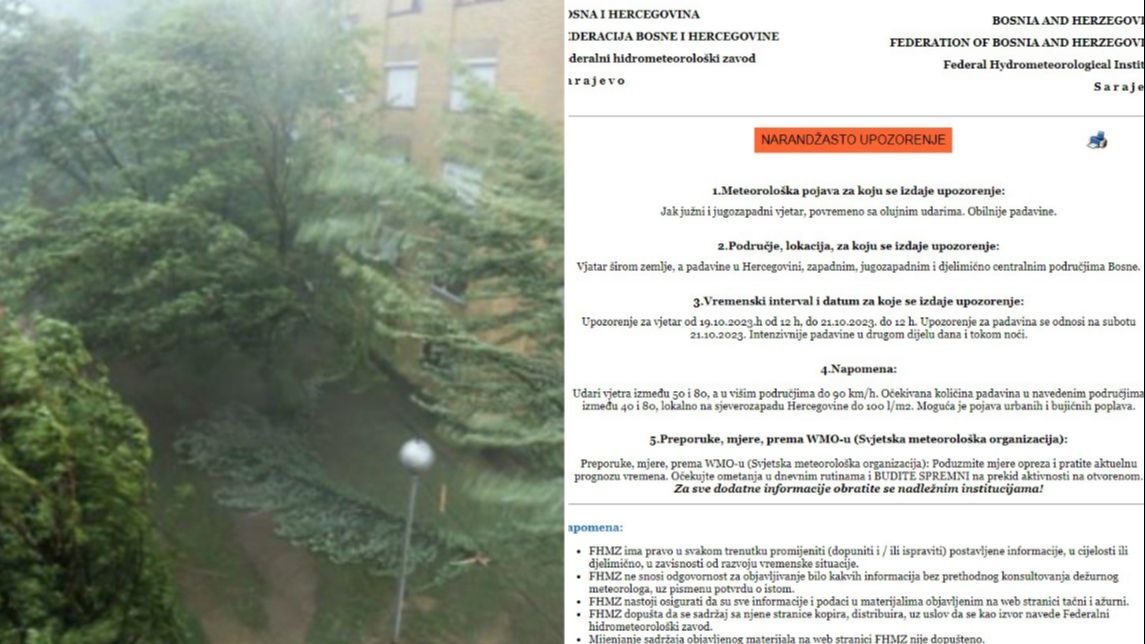 – Udari vjetra između 50 i 80, a u višim područjima do 90 km/h. Očekivana količina padavina u navedenim područjima između 40 i 80, lokalno na sjeverozapadu Hercegovine do 100 l/m2. Moguća je pojava urbanih i bujičnih poplava.