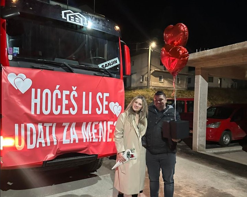 Kamiondžija Sanjin Keran zaprosio je svoju djevojku Selmu Ribić u prostoru firme za koju radi, a to je učinio tako što je na svoj kamion postavio natpis: “Hoćeš li se udati za mene?”
