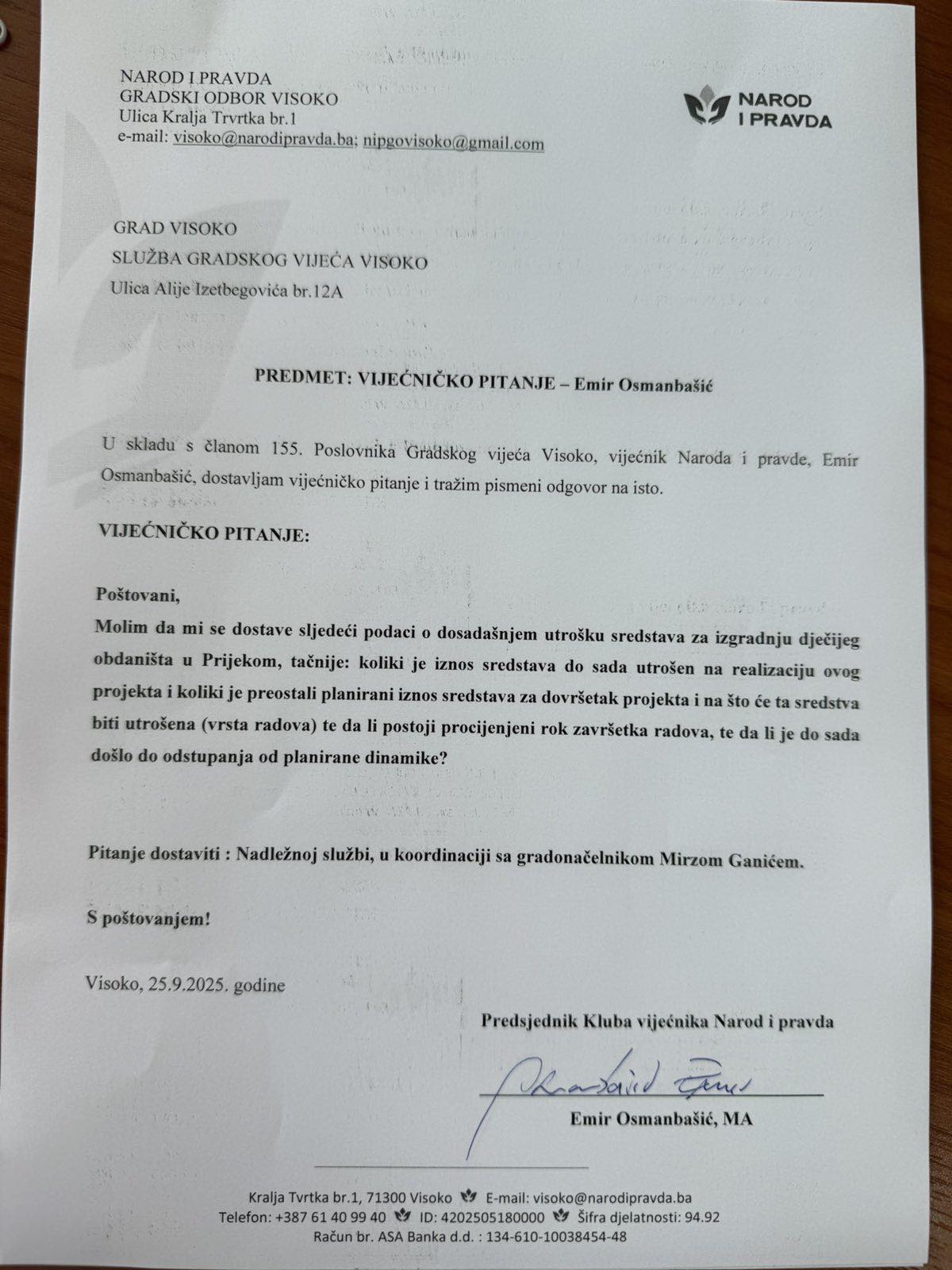 Na desetoj sjednici Gradskog vijeća Grada Visoko, vijećnik Emir Osmanbašić uputio je vijećničko pitanje koje se odnosi na projekat izgradnje dječijeg obdaništa u naselju Prijeko.