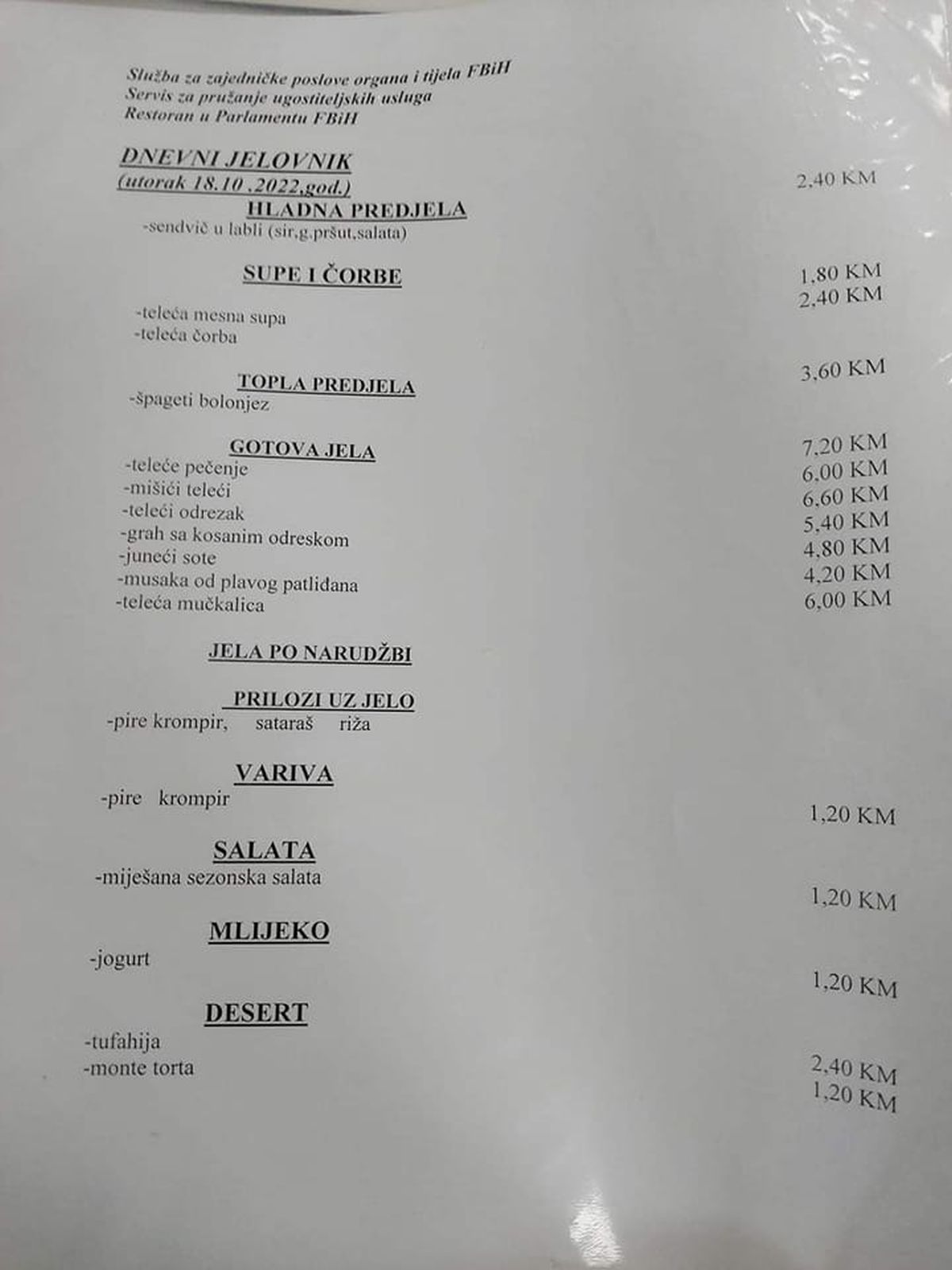 Poslanici u Predstavničkom i Domu naroda Parlamenta Federacije Bosne i Hercegovine u dnevnoj ponudi hrane na raspolaganju imaju bogat izbor hrane i pića....
