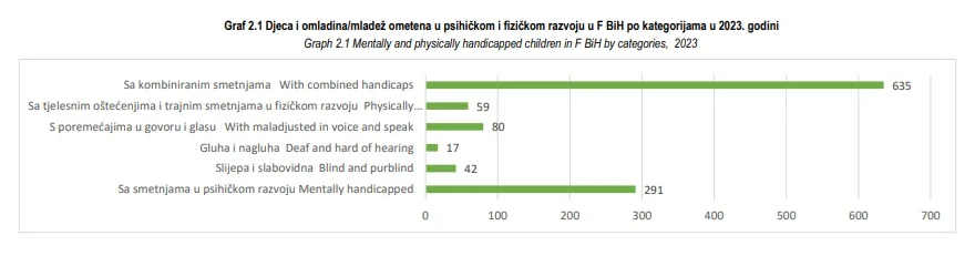 Smetnje u psihičkom razvoju ima njih 291, slijepih i slabovidnih je 42, a 17 su gluhi i nagluhi. Poremećaje u govoru i glasu ima njih 80, tjelesna oštećenja i trajne smetnje u fizičkom razvoju 59, dok najviše ove djece ima kombinirane smetnje – njih 635.
