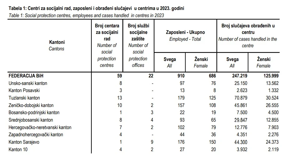 Federalni zavod za statistiku objavio je prve rezultate o korisnicima svih oblika mjera i usluga socijalne zaštite za Federaciju BiH i kantone u 2023. godini. Inače, Federacija BiH ima 59 centara za socijalni rad i 22 službe socijalne zaštite sa 910 zaposlenih, od kojih je 686 žena.
