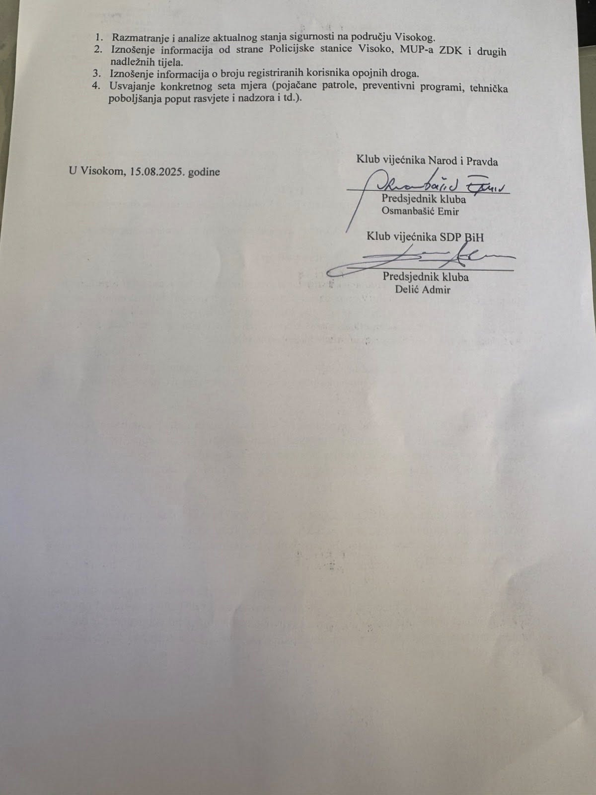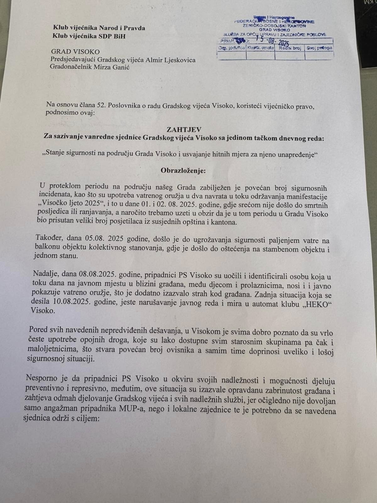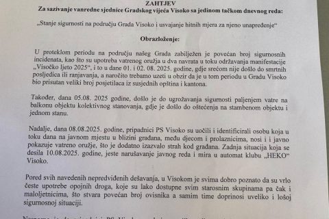 Visoko se suočava s nizom incidenata koji, prema riječima vijećnika, ozbiljno narušavaju javnu sigurnost. Klubovi vijećnika Narod i Pravda i SDP BiH uputili su danas zvaničan zahtjev Gradskom vijeću za hitno sazivanje vanredne sjednice s jednom tačkom dnevnog reda – „Stanje sigurnosti u Visokom i hitne mjere za njeno unapređenje“.