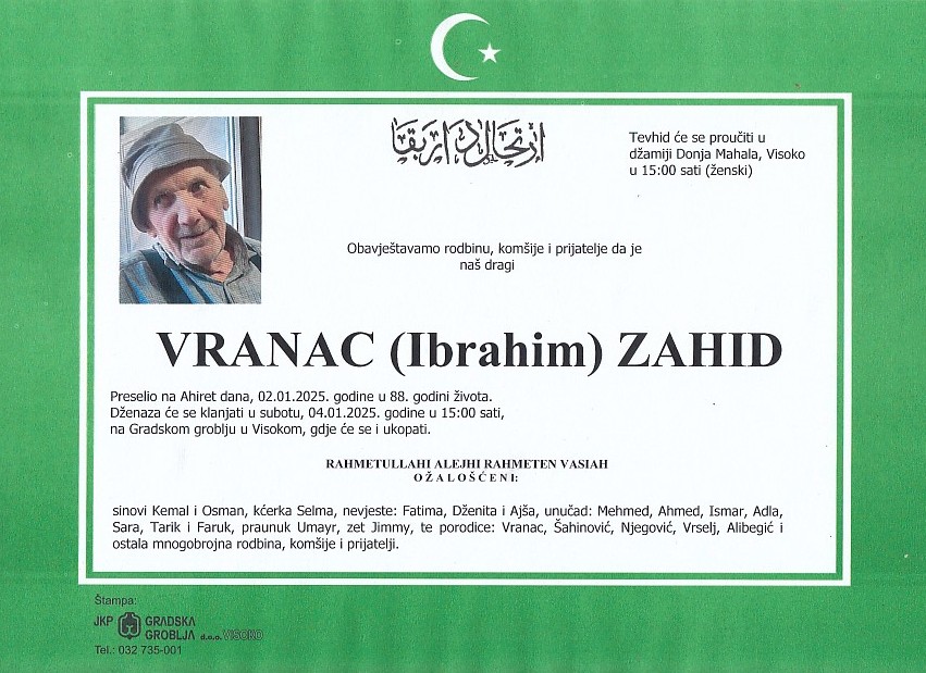 VRANAC (Ibrahim) ZAHID 04.01.2025. godine u 15:00 sati 3. Januara 2025. VRANAC (Ibrahim) ZAHID 04.01.2025. godine u 15:00 sati