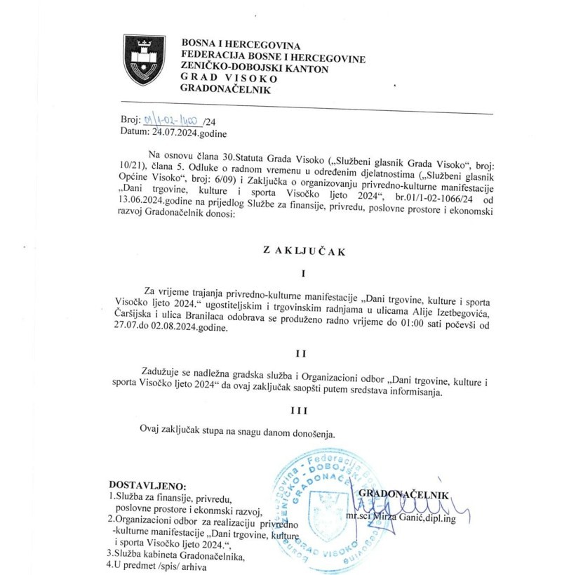 Zaključak o produženom radnom vremenu ugostiteljskih objekata za vrijeme trajanja manifestacije “Dani trgovine, kulture i sporta Visočko ljeto 2024” 29. Jula 2024.