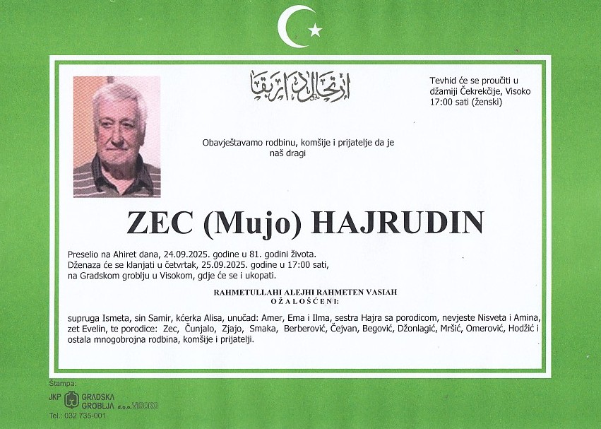 ZEC (Mujo) HAJRUDIN 25.09.2025. u 17:00 sati 25. Septembra 2025.26. Septembra 2025. ZEC (Mujo) HAJRUDIN 25.09.2025. u 17:00 sati