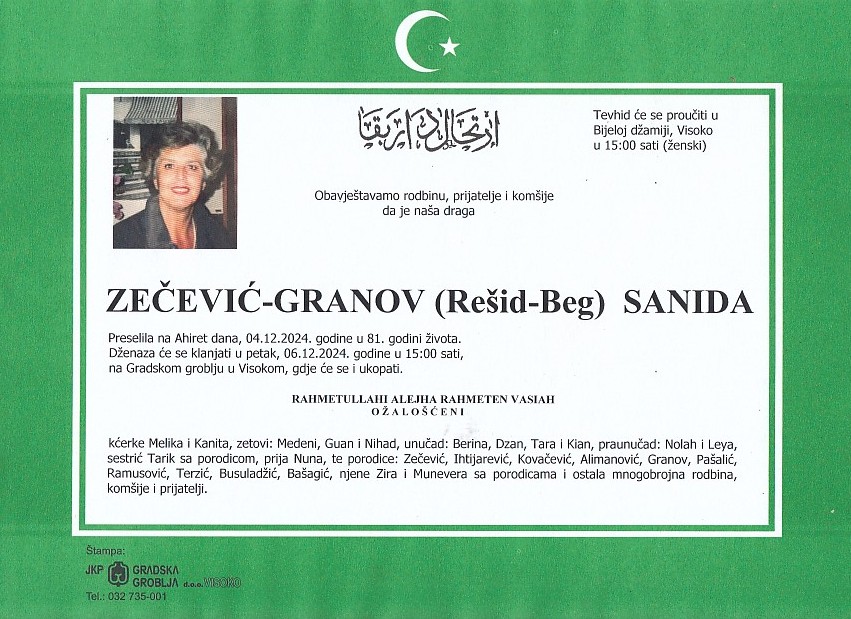 ZEČEVIĆ-GRANOV (Rešid) SANIDA 06.12.2024. godine u 15:00 sati 4. Decembra 2024.5. Decembra 2024. ZEČEVIĆ-GRANOV (Rešid) SANIDA 06.12.2024. godine u 15:00 sati