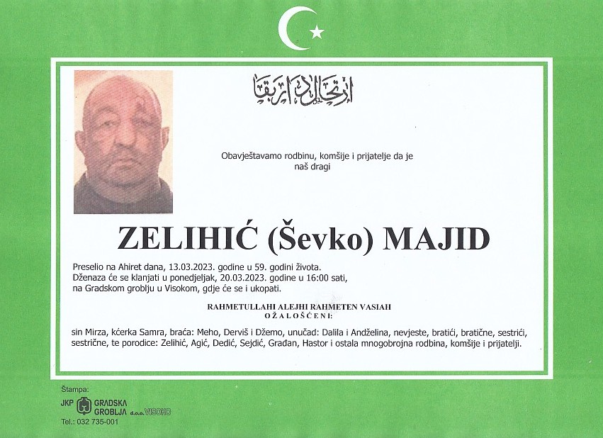 ZELIHIĆ (Ševko) MAJID 20.03.2023. godine u 16:00 sati 18. Marta 2023. ZELIHIĆ (Ševko) MAJID 20.03.2023. godine u 16:00 sati