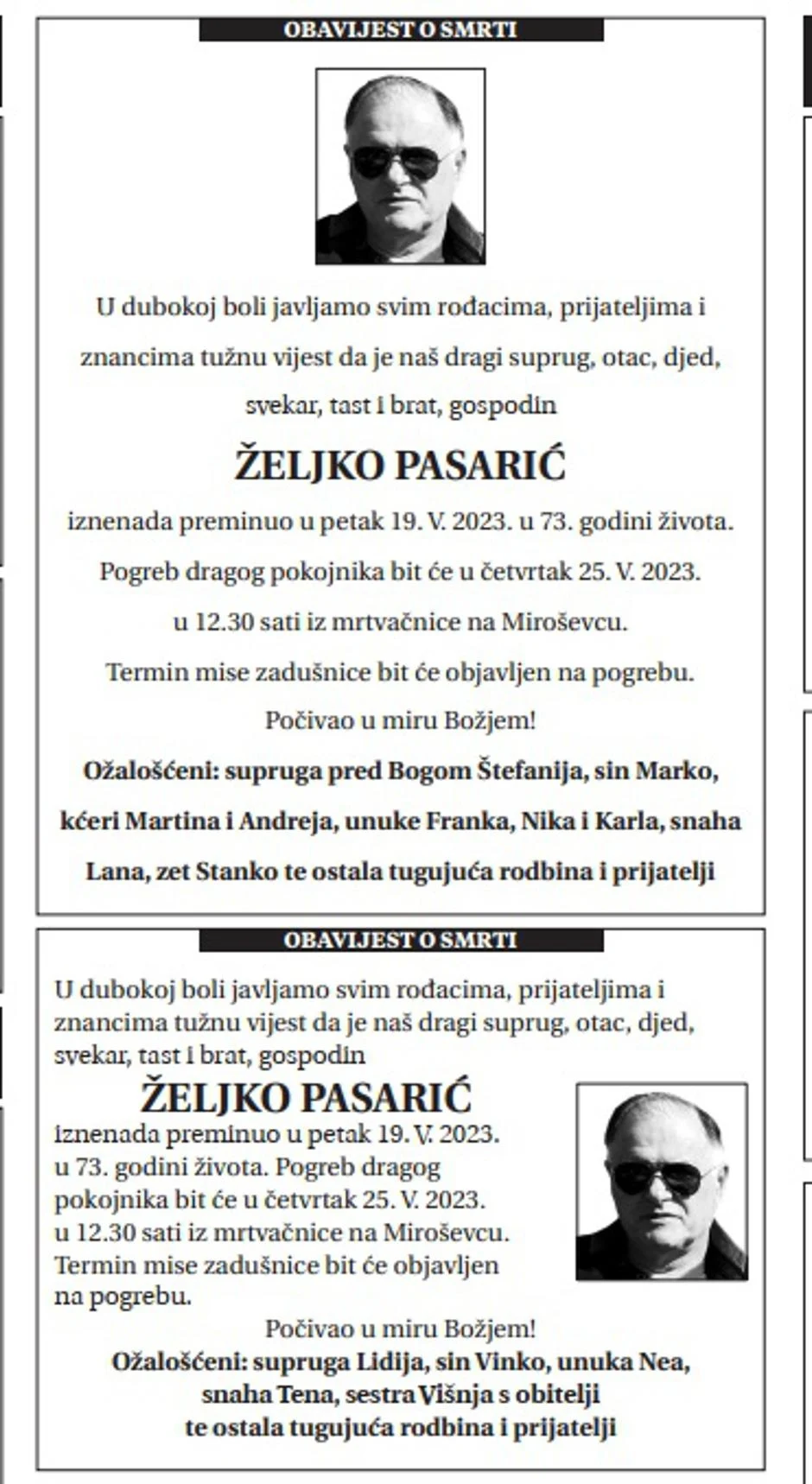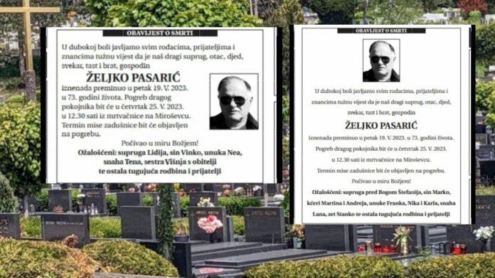 “U dubokoj boli javljamo svim rođacima, prijateljima i znancima tužnu vijest da je naš dragi suprug, otac, djed, svekar, tast i brat, gospodin Željko Pasarić iznenada preminuo u petak 19. V. 2023. u 73. godini života. Pogreb dragog pokojnika bit će u četvrtak 25. V. 2023. u 12.30 sati iz mrtvačnice na Miroševcu. Termin mise zadušnice bit će objavljen na pogrebu. Počivao u miru Božjem!”, stoji u obje osmrtnice.