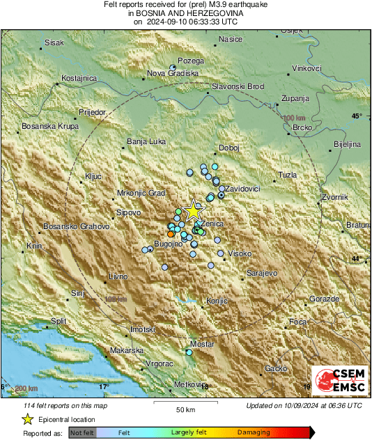 Epicentar je bio 15 kilometara sjeverozapadno od Zenice, zabilježen je na dubini od sedam kilometara.