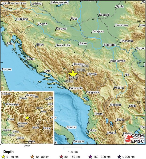 Prema zvaničnim podacima Evropsko-mediteranskog seizmološkog centra (EMSC), epicentar zemljotresa bio je 48 kilometaraa sjeveroistočno od Mostara.