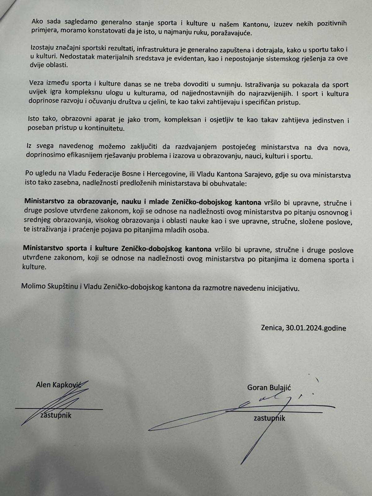 Današnja sjednica Skupštine Zeničko-dobojskog kantona donijela je inicijativu koju su podnijeli zastupnici Alen Kapković i Goran Bulajić. Ova dva predstavnika, iz različitih političkih opcija, zajednički su iznijeli prijedlog za rekonstrukciju Ministarstva za obrazovanje, nauku, kulturu i sport ZDK, predlažući stvaranje dva nova ministarstva – Ministarstva za obrazovanje, nauku i mlade te Ministarstva sporta i kulture.