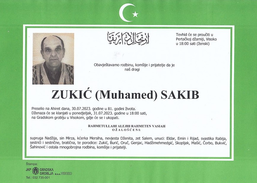 ZUKIĆ (Muhamed) SAKIB 31.07.2023. godine u 18:00 sati 30. Jula 2023. ZUKIĆ (Muhamed) SAKIB 31.07.2023. godine u 18:00 sati