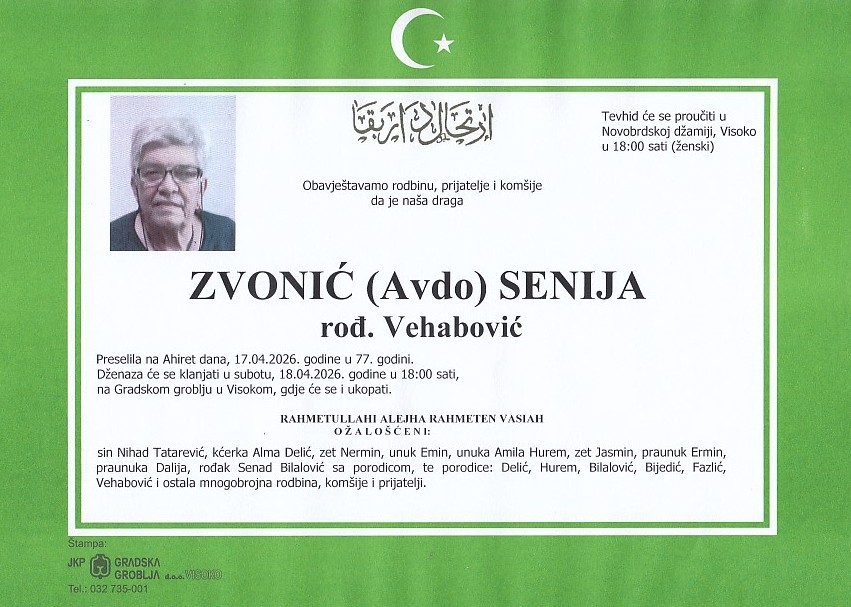 ZVONIĆ (Avdo) SENIJA 18.04.2026. u 18:00 sati