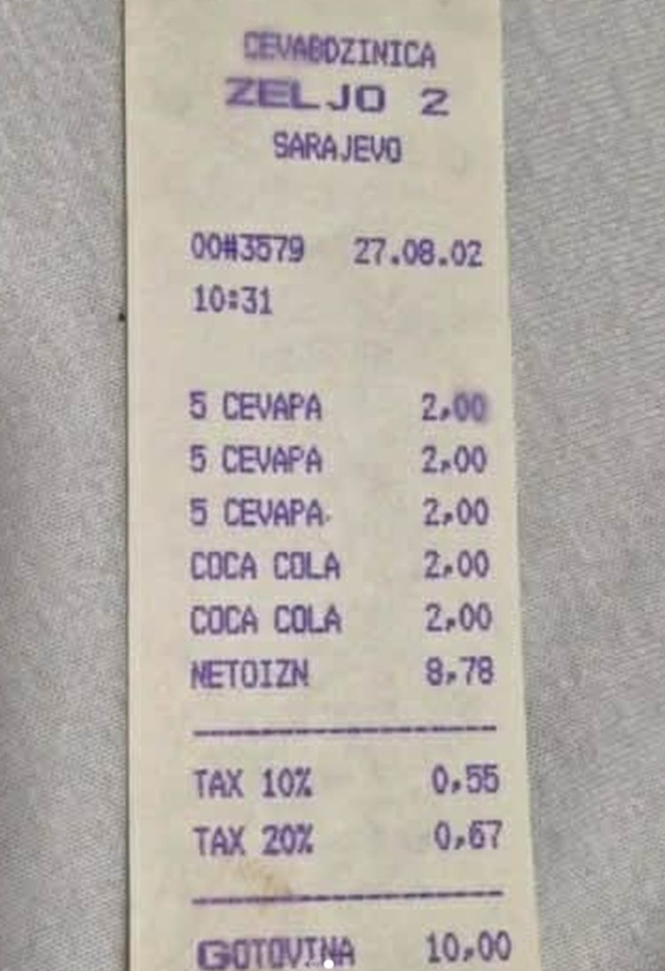 Na računu iz Ćevabdžinice Željo, koji je iznosio 10 maraka, moglo se kupiti tri porcije ćevapa i dvije Coca-Cole.